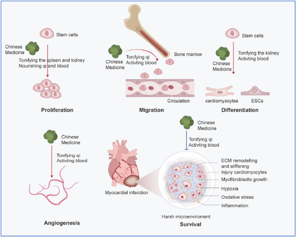 通过对中医药调控干细胞的研究进行归纳,基于各方剂组成,整理出中药通过干预干细胞的不同阶段治疗心肌梗死的理论:(1)在干细胞增殖过程中,中药主要通过补脾肾、益气血发挥作用;(2)在干细胞迁移、归巢过程中,中药主要通过活血化瘀发挥作用;(3)在干细胞分化过程中,中药主要通过补肾活血发挥作用;(4)在促进血管生成过程中,中药主要通过益气活血发挥作用;(5) 中药通过益气活血促进骨髓间充质干细胞在心肌梗死的微环境中存活。