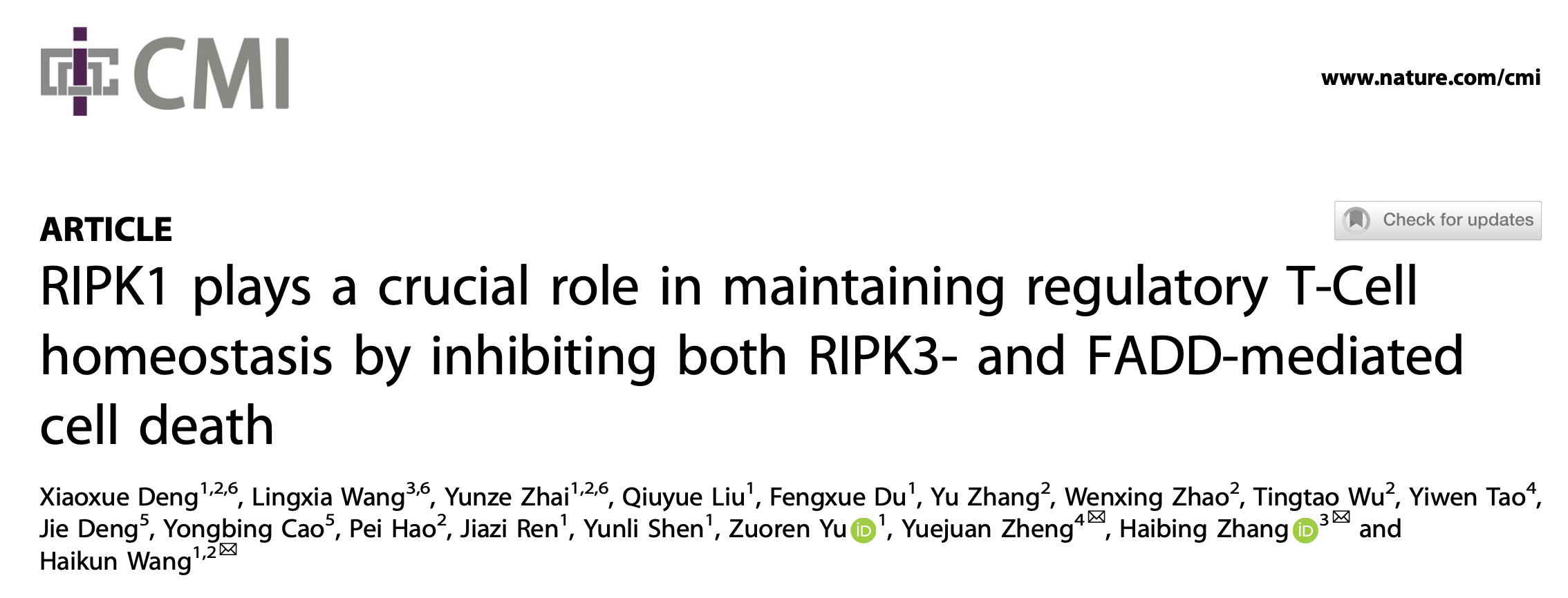 国际著名学术期刊Cellular & Molecular Immunology(SCI 1区,IF=24.10)在线发表了成人在线 郑月娟课题组与同济大学附属东方医院王海坤课题组、中国科学院章海兵课题组合作的研究论文“RIPK1 Plays a Crucial Role in Maintaining Regulatory T Cell Homeostasis by Inhibiting both RIPK3 and FADD-Mediated Cell Death”,该研究发现受体相关蛋白激酶1(receptor-interacting protein kinase 1,RIPK1)在维持Treg细胞和常规CD4+ T细胞(Tconv)的稳态的机制不同,Treg细胞中RIPK1蛋白通过抑制FADD和RIPK3介导的凋亡和坏死促进Treg细胞的存活,而在常规CD4+ T细胞中,RIPK1主要通过抑制凋亡促进 CD4+ T细胞的存活。