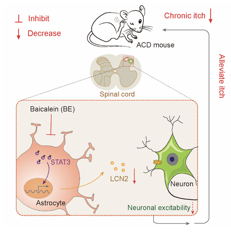 该研究建立过敏性接触性皮炎(allergic contact dermatitis,ACD)诱发的慢性痒小鼠模型,利用药理学及行为学实验发现,黄芩素呈剂量依赖性地抑制ACD小鼠的慢性痒,并显著减轻ACD小鼠造模部位的皮肤损伤。研究报道脊髓星形胶质细胞在慢性瘙痒发病机制中发挥着关键性作用,黄芩素可显著减少ACD小鼠脊髓背角的星形胶质细胞激活。结合体内实验及脊髓星形胶质细胞的体外培养实验,联合证明了黄芩素可调控脊髓星形胶质细胞STAT3- LCN2通路。该研究阐明了黄芩素抑制脊髓星形胶质细胞活化缓解慢性瘙痒的作用及机制,为开发治疗慢性瘙痒的新药物提供了理论依据和重要参考。