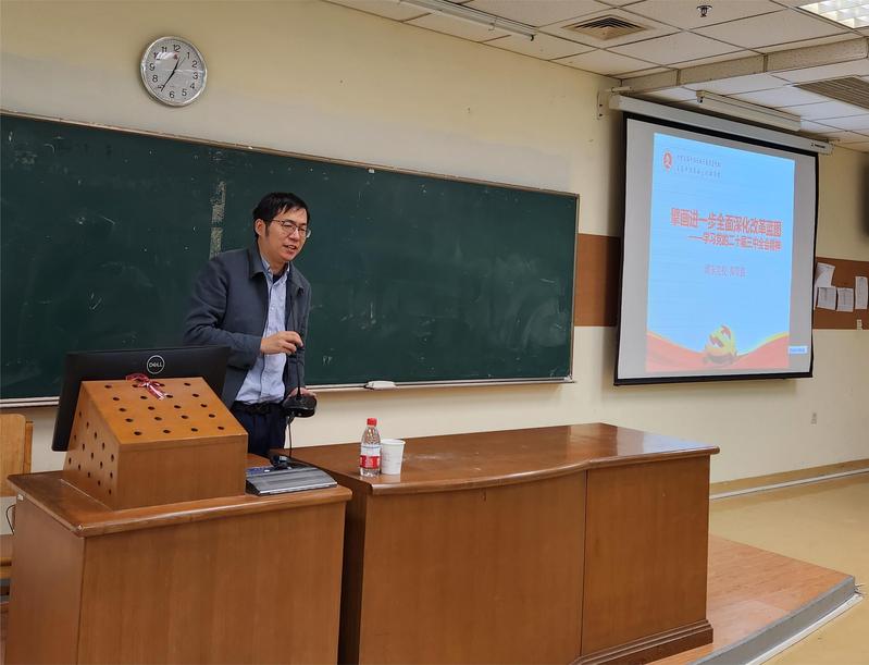 为深入贯彻学习党的二十届三中全会精神,提高全体教职工和师生党员的政治素养和思想认识,2024年11月20日,成人在线 在教学楼6402教室开展教职工政治理论学习暨学习贯彻党的二十届三中全会精神专题学习会。本次专题学习邀请了中共上海市浦东新区委员会党校党史教研室主任郑智鑫主讲,主题为《擘画进一步全面深化改革蓝图——学习贯彻党的二十届三中全会精神》,成人在线 全体教职工、师生党员参加了此次学习会。