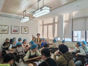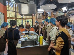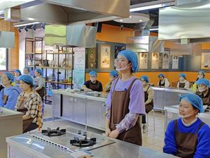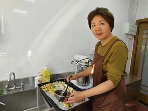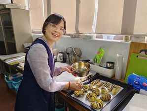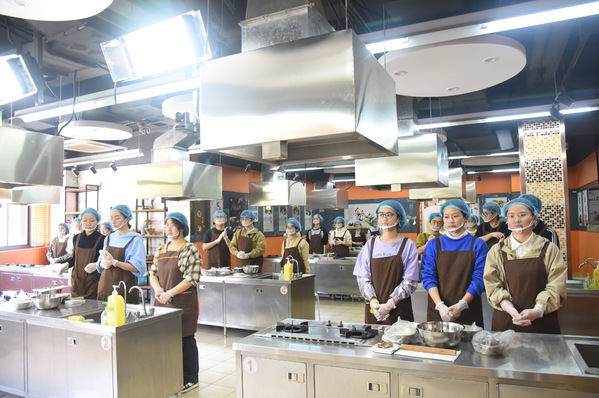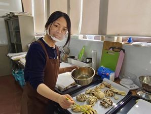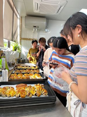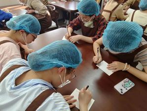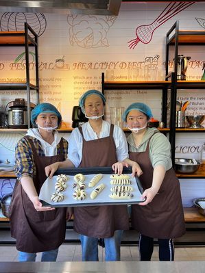 随后,大家取回经过发酵的面团,用称量工具把面包胚等分成多个小剂子,在案板上轻轻地整理、搓圆、按压,包入红豆沙馅,将注意力集中在每一个制作细节,感受“正念”的魅力,最后将成品送入烤箱醒发、烘烤。
