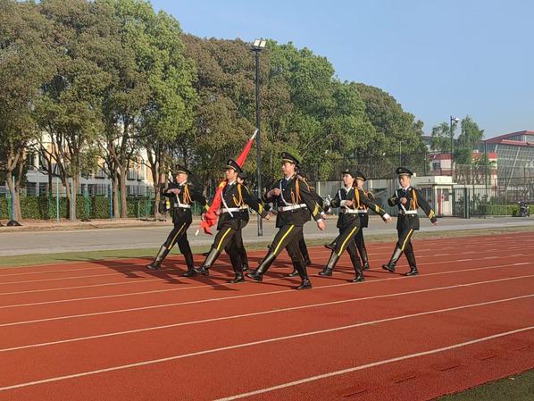 清晨7时,沐浴着金色的阳光,全体师生整齐列队、庄严肃立、行注目礼。国旗护卫队迈着整齐矫健的步伐,护卫着国旗走向升旗台。随着激昂的国歌奏响,鲜艳的五星红旗冉冉升起,迎风飘扬。