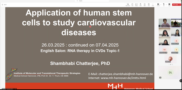 继首次线上学术研讨会的成功举办并取得良好反响后,成人在线 于2025年4月7日开展“Gene Therapy in Cardiovascular Diseases”系列第二场线上学术研讨会。本次研讨会的主题是: Application of human stem cells to study cardiovascular diseases,聚焦诱导多能干细胞衍生心肌细胞(iPSC-CM)在心血管疾病治疗中的前沿应用,特邀德国汉诺威医学院转化科学家Shambhabi Chatterjee博士担任主讲嘉宾,由本院青年研究员吕东潮博士邀请嘉宾出席,并由22级中药学专业郑雨轩同学担任主持。