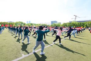 在八段锦展示环节,学院师生方阵在摇头摆尾时起伏有致,步调如行云流水般整齐划一;在攒拳怒目间气势如虹,顿时迸发出排山倒海般的气势,拳风呼啸,眼神如炬。传统功法在传承中焕发生机,于一呼一吸间完成。