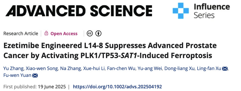 近日,成人在线 袁富文研究员团队联合交叉科学研究院张宇、安徽医科大学第一附属医院徐凌凡在Advanced Science发表题为“Ezetimibe Engineered L14-8 Suppresses Advanced Prostate Cancer by Activating PLK1/TP53-SAT1-Induced Ferroptosis”的研究成果。该研究基于降脂药依折麦布(Ezetimibe)开发出一种可高效抑制耐药性前列腺癌的新型小分子化合物L14-8。该药物通过激活铁死亡(ferroptosis)通路杀死癌细胞,且在动物实验中未显示明显毒性,为晚期前列腺癌患者提供了独立于雄激素受体(AR)信号通路的新治疗策略。