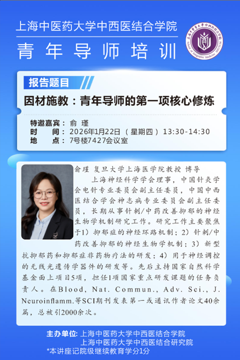 作为中西医结合一级博士学位点导师培训系列讲座之一,2026122日特邀复旦大学上海医学院俞瑾教授,以“因材施教:青年导师的第一项核心修炼”为主题,分享了青年导师在科研人才培养中的核心修炼路径,为高等教育与导师发展提供了重要启示。讲座聚焦师生共同成长,从“辩材”“施教”“共生”三个维度层层展开,系统解析了因材施教在研究生培养中的实践策略与理念内涵。