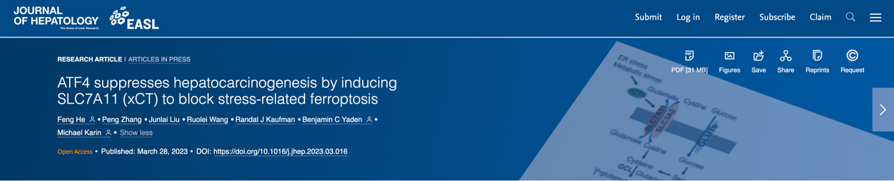 近日,成人在线 中西医结合研究院何锋研究员团队联合美国礼来制药公司和美国加州大学圣地亚哥分校研究团队在欧洲肝病研究学会期刊《Journal of Hepatology》(IF=30.083)在线发表题为“ATF4 suppresses hepatocarcinogenesis by inducing SLC7A11 (xCT) to block stress-related ferroptosis”的研究论文。该研究在非酒精性脂肪肝炎和肝癌的研究方面取得重要进展,为非酒精性脂肪炎等代谢性肝病向肝癌进展的防治提供了新的见解。